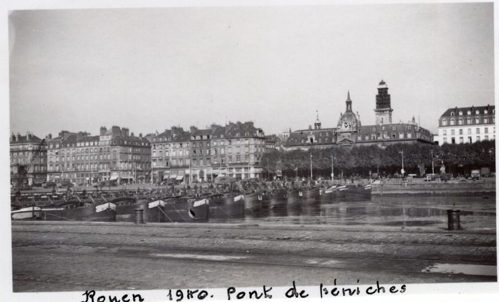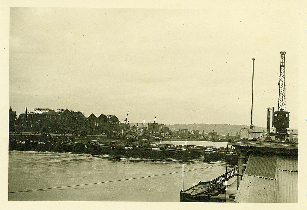 En arrière-plan le cargo belge "Liège", et en premier plan un pont provisoire avec plusieurs péniches. Les noms suivants sont lisible: