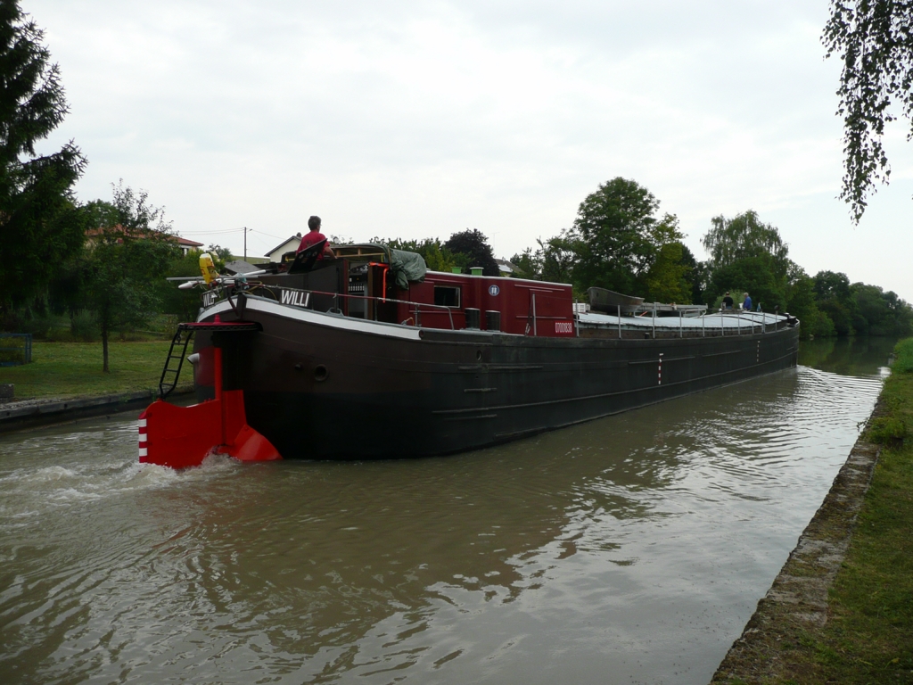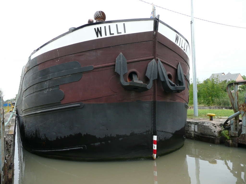 J'étais en excursion en canotage et j'ai passé la nuit sur le pont avant du WILLI. Malheureusement, le crépuscule était déjà un peu avancé, donc la photo du cul (les bateliers allemands disent aussi "Arsch" :mrgreen: ) n'est pas particulièrement bonne. Mais vous pouvez lire : SBD299 - SBD, qui signifie Saarbrücken Deutschland.