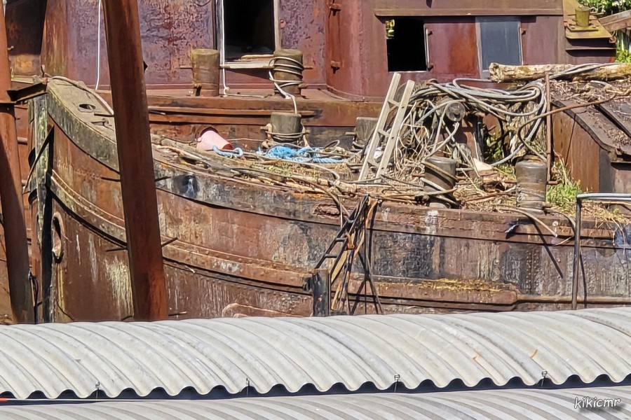 Ça faisait des années qu'il était amarré dans les arbres à l'amont du chantier, on n'en voyait qu'un bout de bordaille et le haut des fargues, le reste était masqué par d'autres bateaux ; personne n'avait encore su me dire quelle était sa devise, mais maintenant on peut mieux voir le nez :