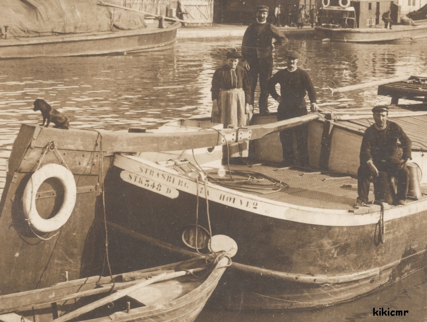 Le bateau, LA HOUVE 2, a pour port d'attache Strasbourg, orthographié Strasburg ; son matricule du temps de l'Alsace annexée est bien lisible, ST.K 348 D, un matricule de Straßburg-Kanal - Deutschland (ou plutôt Straßburg-Kanäle - Deutschland, au pluriel ? puisqu'en français c'est Strasbourg-canaux).