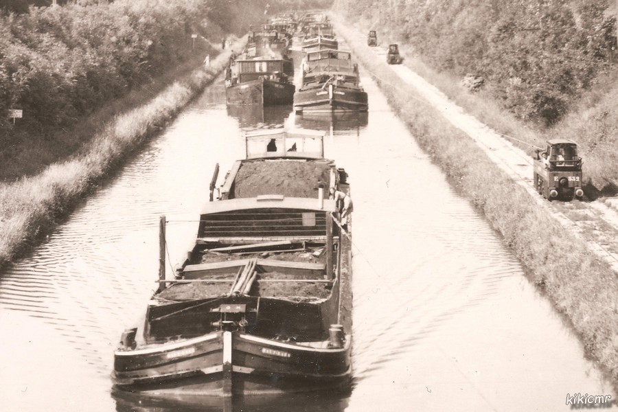 - d'abord la vue générale, prise du pont à l'entrée du village de Mauvages, où l'on voit le croisement de deux rames ; les bateaux qui viennent vers nous sont sortis de la voûte de 4877m de longueur qui permet de passer du versant Marne au versant Moselle du canal de la Marne au Rhin, ils se dirigent vers l'est