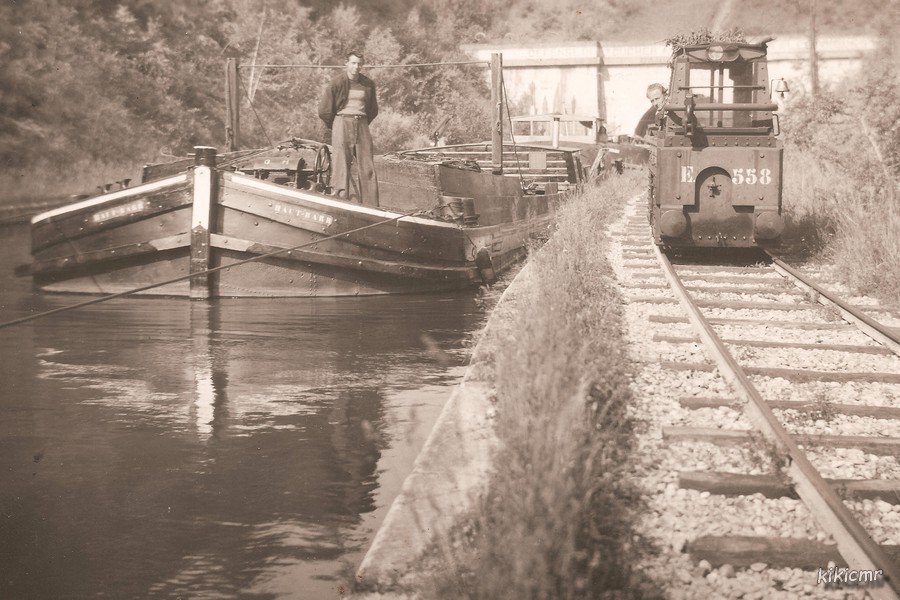 - d'abord la vue générale, prise du pont à l'entrée du village de Mauvages, où l'on voit le croisement de deux rames ; les bateaux qui viennent vers nous sont sortis de la voûte de 4877m de longueur qui permet de passer du versant Marne au versant Moselle du canal de la Marne au Rhin, ils se dirigent vers l'est