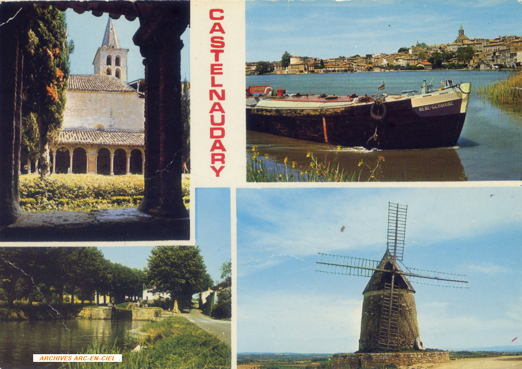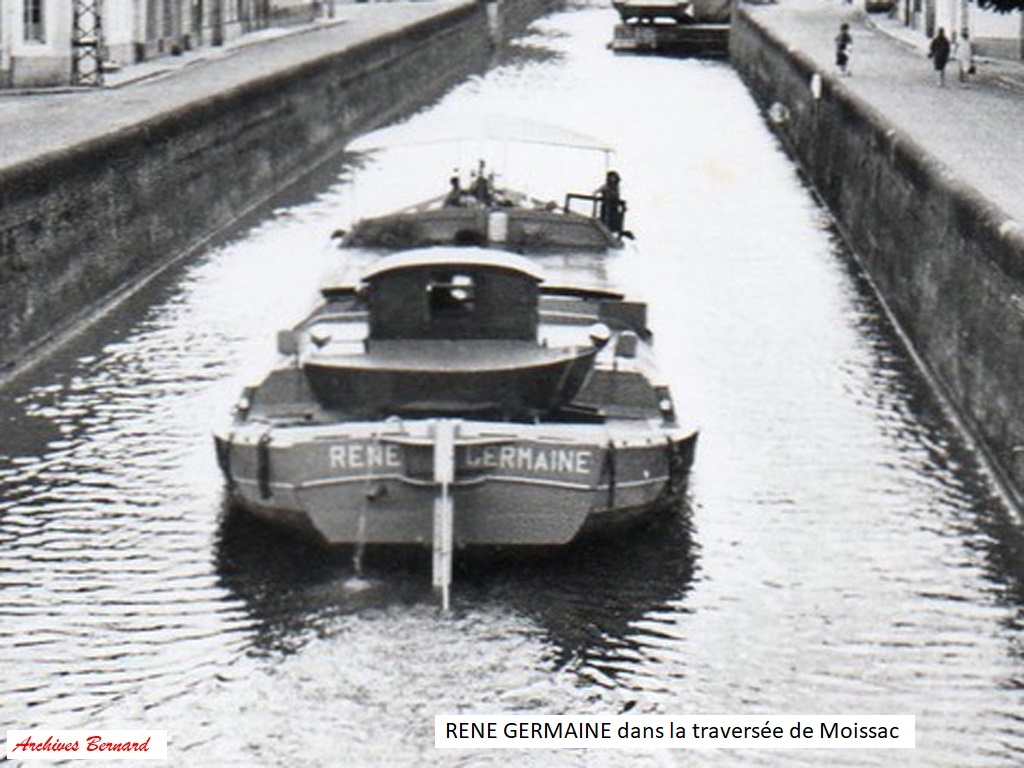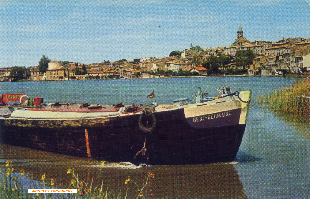 Ici le bateau navigue entre les murs en brique rouge de Moissac.