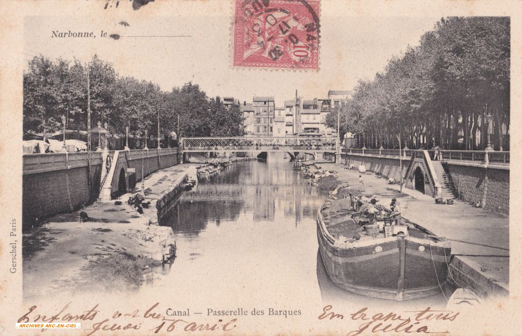 Sur cette carte de Narbonne avec en arrière-plan le pont des Marchands et ses maisons, voici un bateau dit Barque de patron ou barque du Midi.