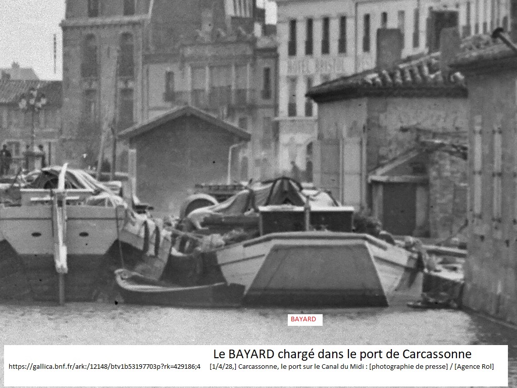 Bonjour. La bibliothèque Gallica nous présente une superbe photo du port de Carcassonne en 1928. La qualité de la photo autorise des agrandissements convenables. Sur la gauche, le bateau avec un avant à presse amarré au quai est le BAYARD.