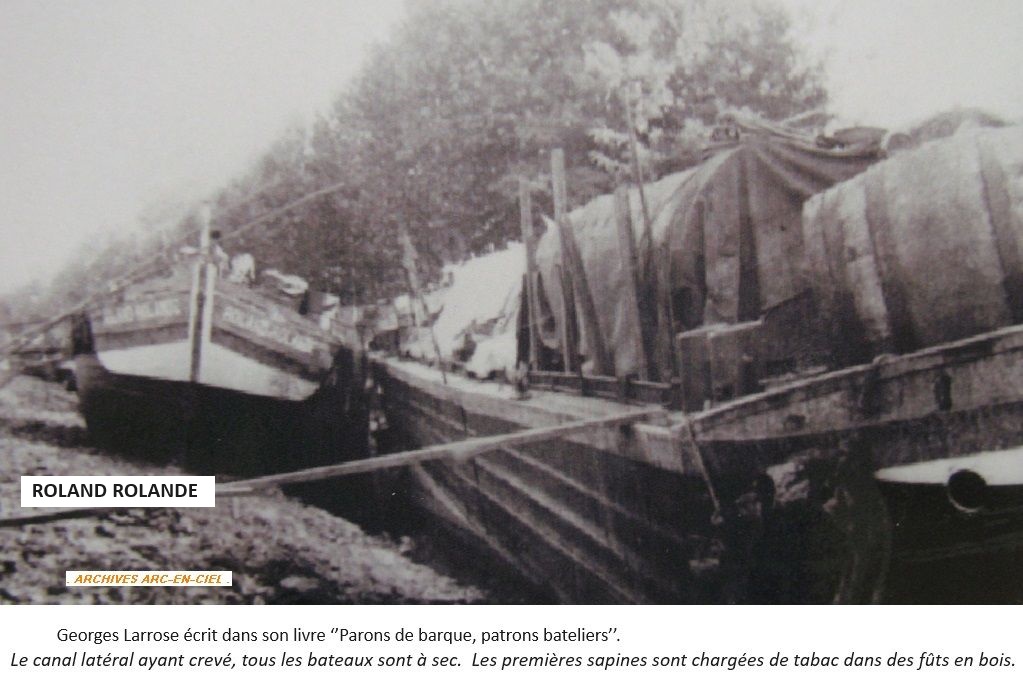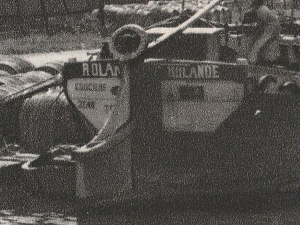 Voici un bateau en bois du Midi, le ROLAND ROLANDE amarré dans le port d’Agen. Un agrandissement de la photo nous permet de voir le nom de son propriétaire.