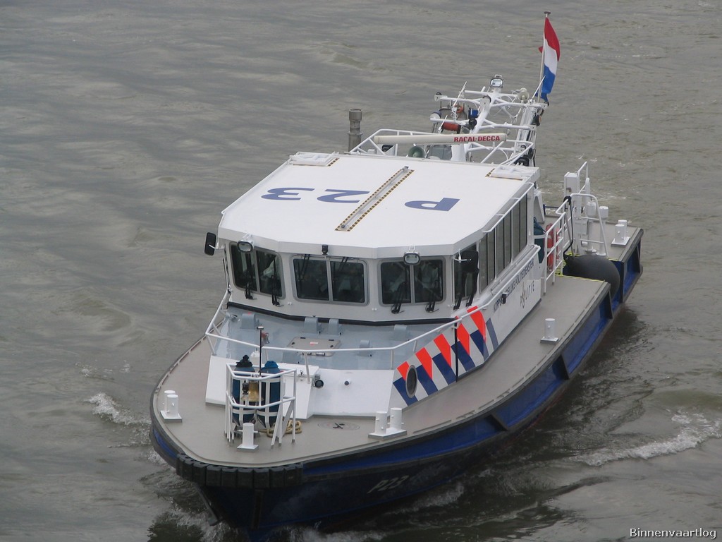 P 23 , 18,80 x 5,25 x 1,25 , Bouwjaar 1998 , Werf Damen Shipyard in Gorinchem ( Nederland ) , 2 x 605 pk MTU , eigenaar KLPD afdeling Waterpolitie.
