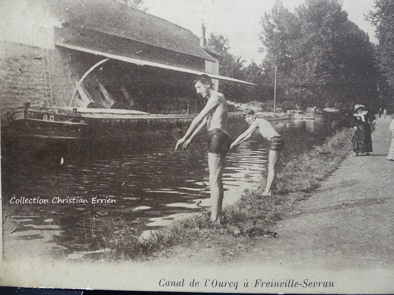 Sur cette CPA prise à Freinville Sevran au début du 20ème siècle jolie leçon de natation et en arrière plan une flûte , la 90 où la 80