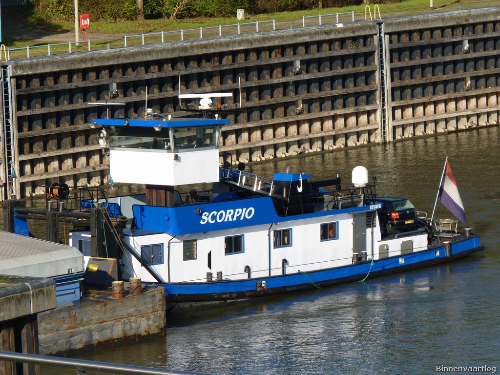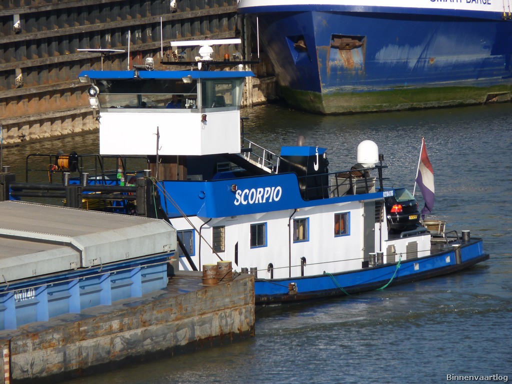 Scorpio , 23,06 x 5,94 x 2,15 , Bouwjaar 1943 , Werf A.S.M in Arnhem , 2 x 537 pk Cummins , ex H 032 , ex 2 x M 299, ex Marlijn , ex Christa , ex 2 x Dirk Sr , ex Ragnar , ex Stier , ex Tasmanzee II , ex Witte Zee , ex Obelix , eigenaar Rederij De Jong BV in Rotterdam , ENI 02104116