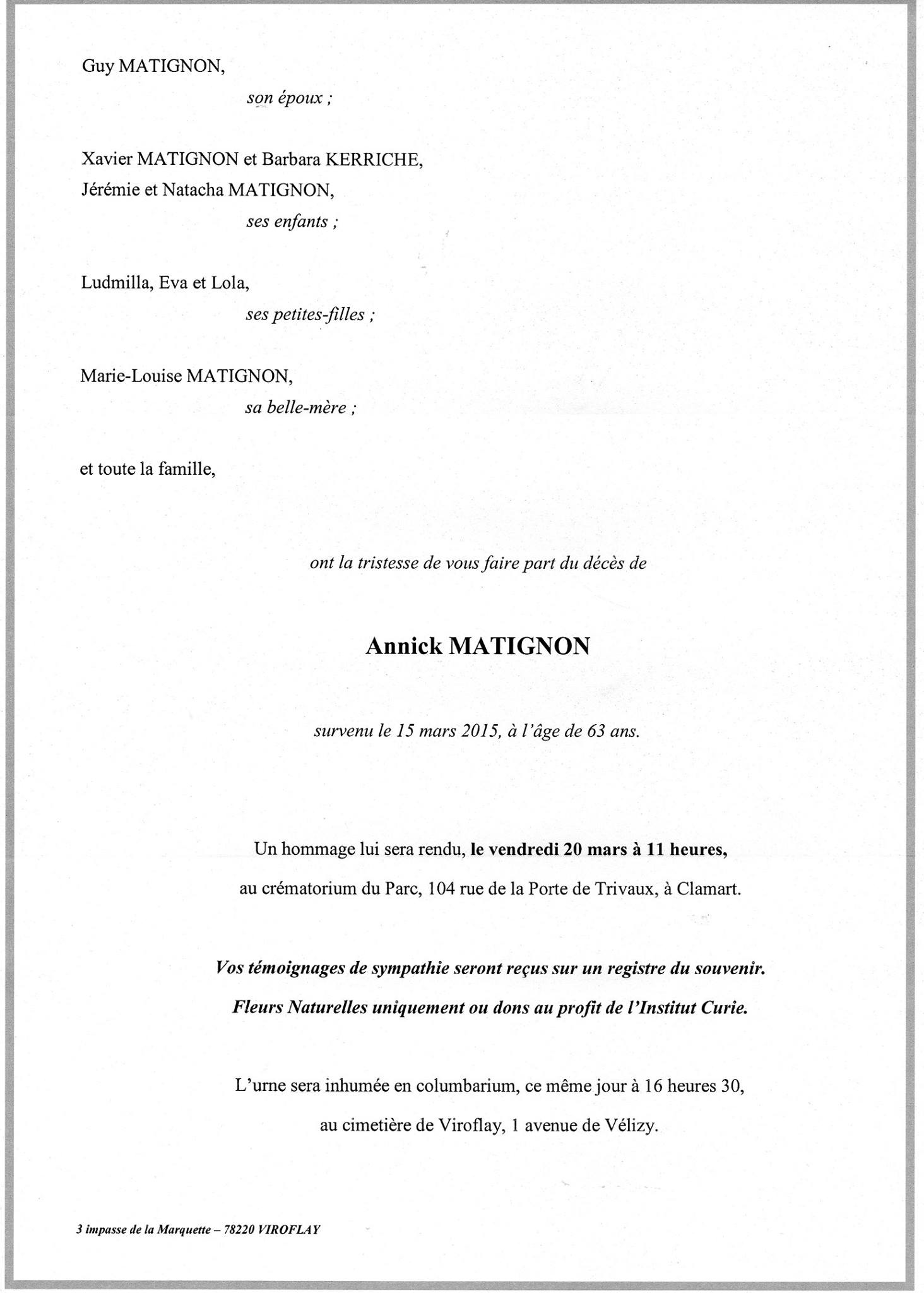 Nous apprenons avec beaucoup de tristesse le décès de Annick Matignon, décès survenu à l'âge 63 ans des suites d'une maladie appelée "Putain de Crabe" !