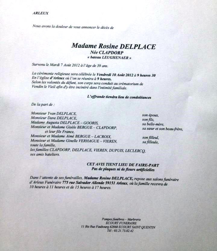 nous venons d'apprendre le décès de Madame Delplace Rosine du bateau