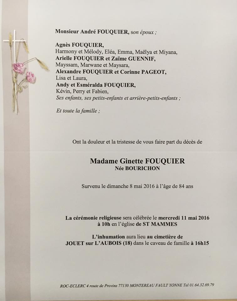 Décès de Ginette Fouquier née Bourichon....