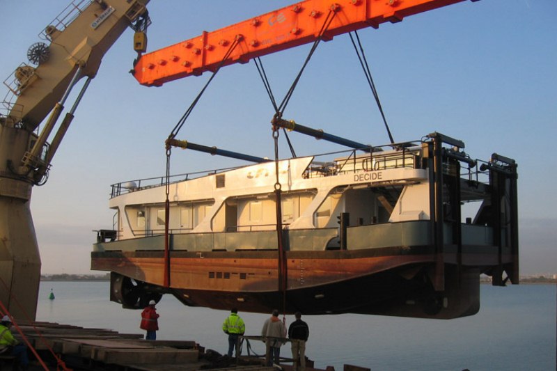 une photo du decide comme il est rare de voir,d habitude en cale seche mais la pendu,faut avoir confiance en son materiel,je pense que c est a l occasion de sa livraison,