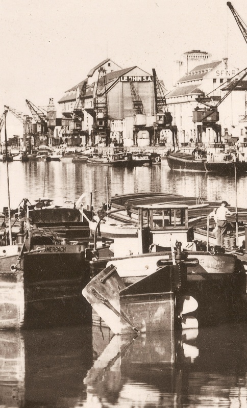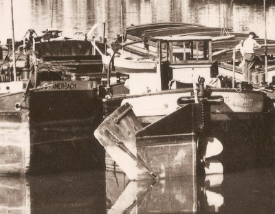 La photo noir et blanc montre une peniche AMERBACH aussi - l`autre AMERBACH de 1928, qui était un BRAG jusque 1932. Alors, la photo de Strasbourg doit être pris en 1931 (date de construction d`une Solvay sur la photo) ou 1932! On peut retrouver l`étrave verticale de l`AMERBACH de 1928 ici - le musée à Bremerhaven possède les plans origineaux.
