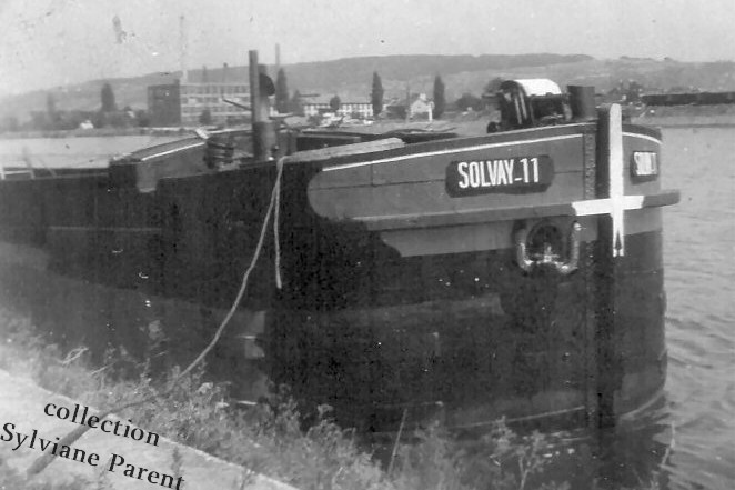 SOLVAY 11 dans le port de Dombasle, en attente de déchargement de charbon ; cette photo date de 1955, car ensuite le déchargement de charbon a été déplace sur la rive opposé du large de Dombasle (à son bord, c'est le