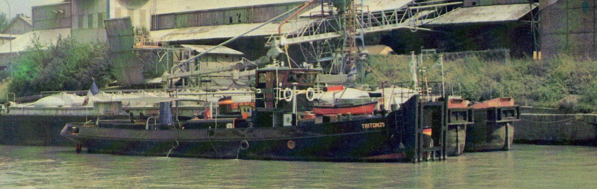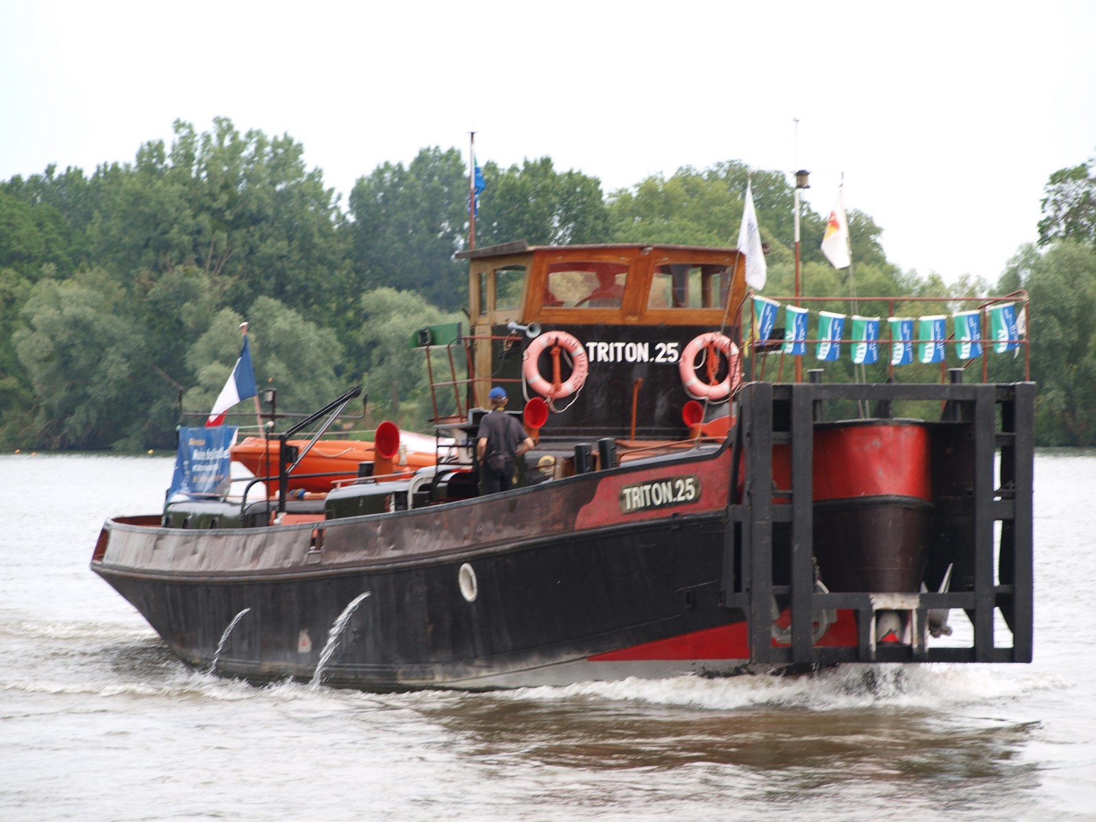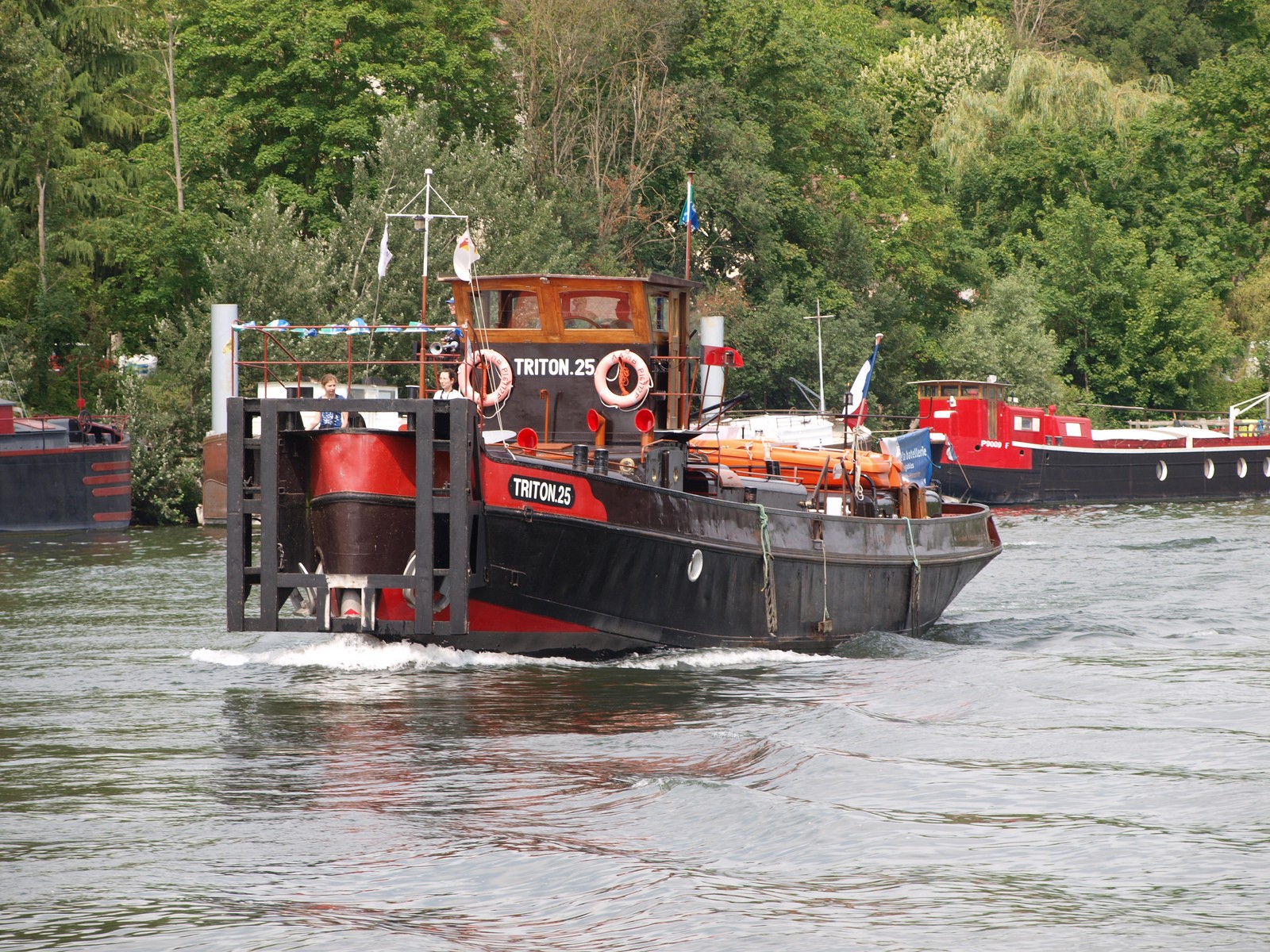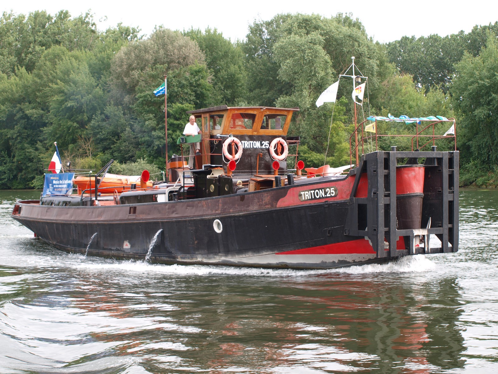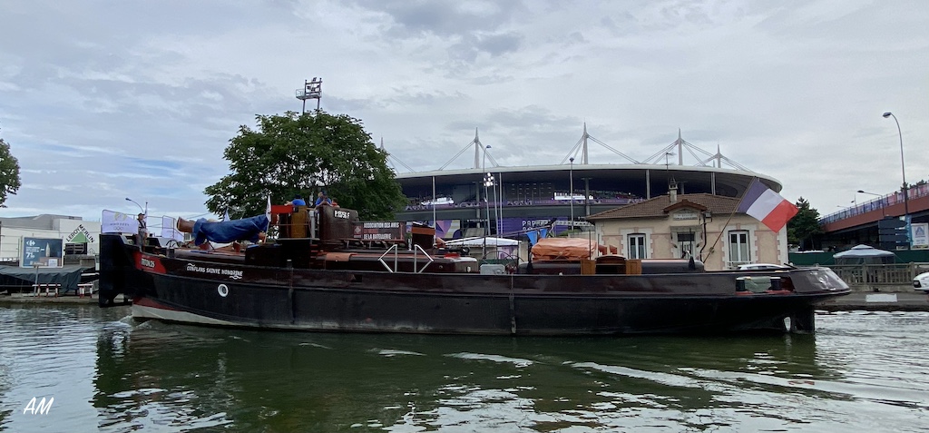 Triton 25, montant sur le canal Saint Denis, pour le relai de la flamme Olympique du vendredi 26 Juillet, jour de l'ouverture des Jeux Olympiques de Paris 2024. Suivi du remorqueur Fauvette.