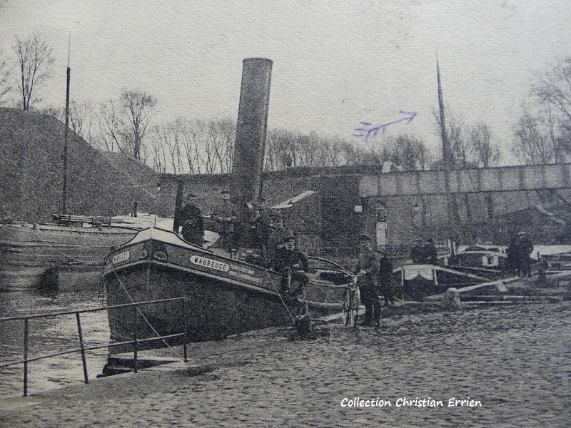 Sur cette carte postale Allemande prise durant la première guerre mondiale sur la Sambre on peut voir le remorqueur MAUBEUGE.