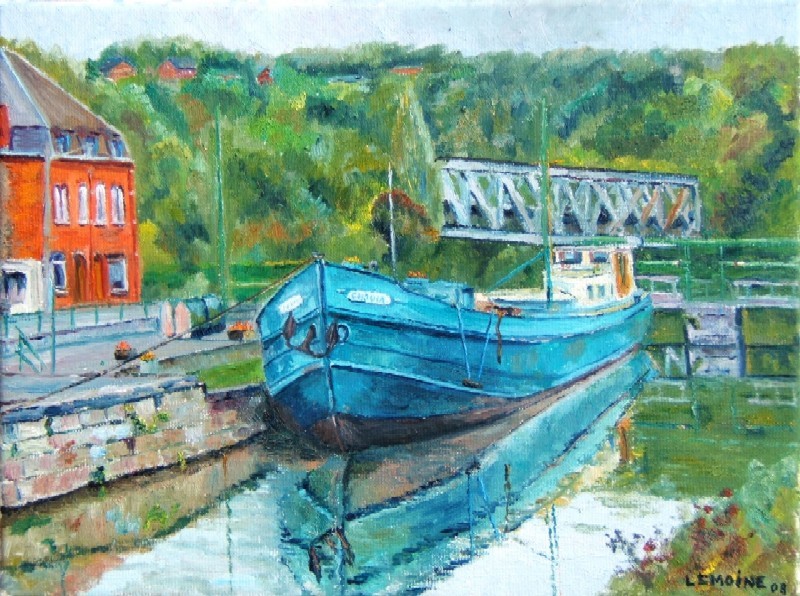 Nous sommes aujourd'hui a Thuin sur la Sambre pres de l'ecluse n°5. C'est un luxemotor que j'ai peint.