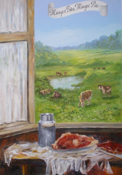 Peinture acrylique, recouverte de vernis "cristal" sur contre-plaqué, pour décorer une salle de resto "bio" en Ardèche.