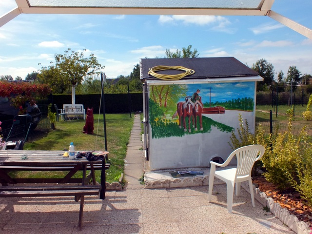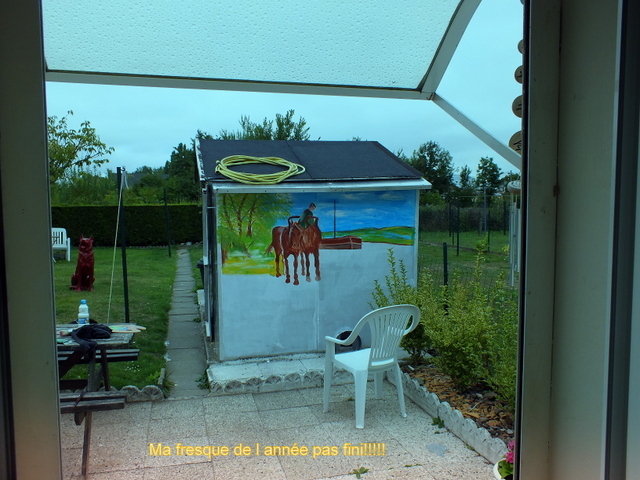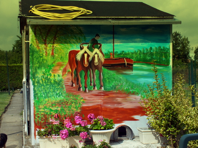 bonjour!! comme je n ait plus beaucoup d inspiration je me suit dit pourquoi !je ferais pas une fresque dans mon jardin!!comme il y a un pilonne avec lumière du cotée de la maison: la nuit quand je suit éveiller je voie ma fresque avec cette lumière qui me donne l impression que le canal est derrière chez moi !!ses supers voila le début