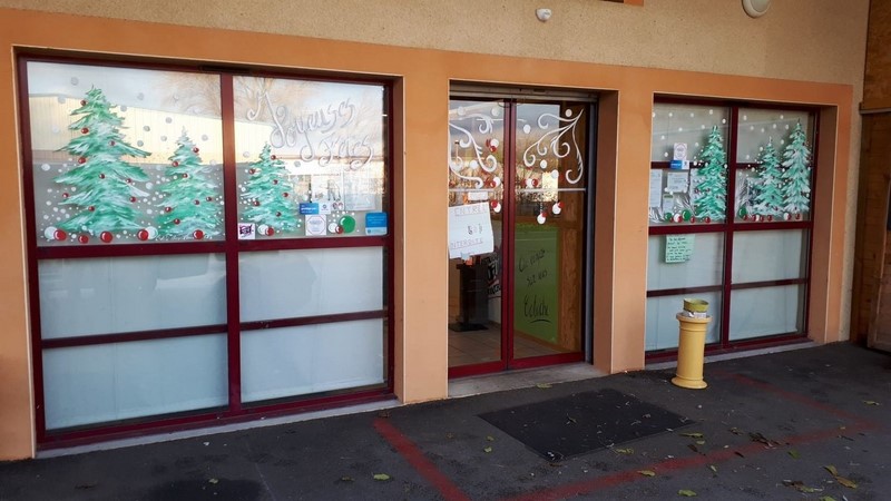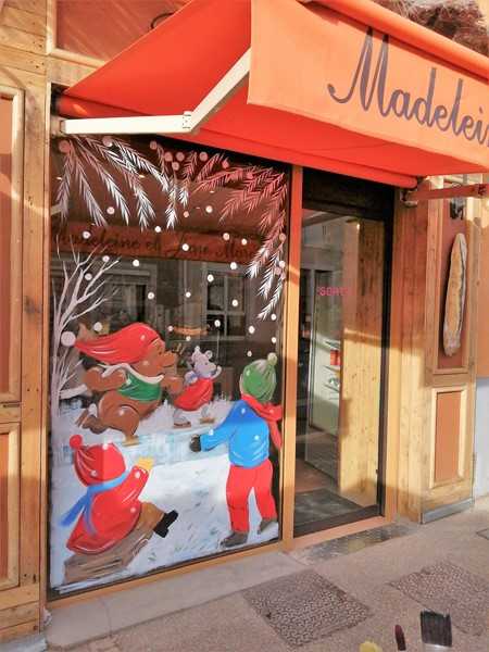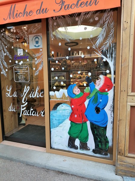 Déco sur vitres à la boulangerie d'Hauterives dans la Drome (village du facteur Cheval).