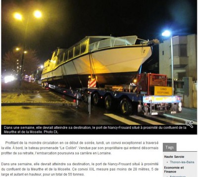 bah du coup, avec ces infos, je viens de trouver un article du Dauphiné Libéré en date du 21 mars 2012, "Le COLIBRI est parti naviguer en Lorraine" :