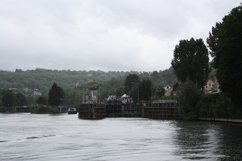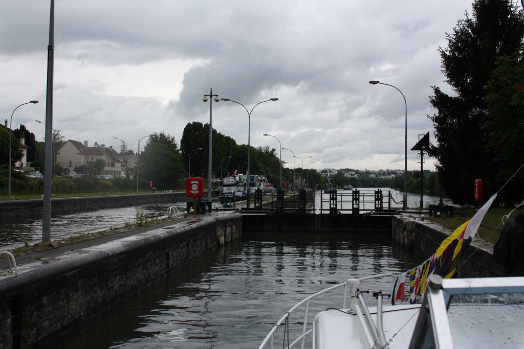 L'entrée de JAGUAR et ORCA dans l'écluse, et aussi un Plaisance qui nous accompagne par le plus grand des hasards, Ils reviennent d'une semaine de Vacances du Canal du Nivernais, et descendent en dessous de Conflans.