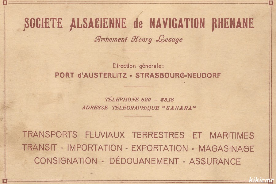 Cette photo est éditée comme une carte postale sépia, mais au verso, pas de place pour la correspondance, juste les coordonnées de la Société Alsacienne de Navigation Rhénane (SANARA) :