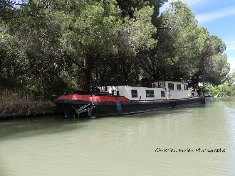 Voici un ancien remorqueur transformé en logement . Il est stationné sur le canal du Midi à Port la Robine