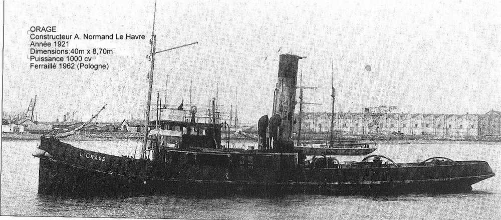 L'Orage remorqueur de l'Union Française Maritime faisait partie d'une série de 21 remorqueurs de 1000 cv commandée après la grande guerre par le gouvernement français