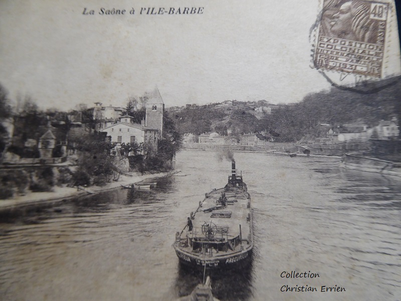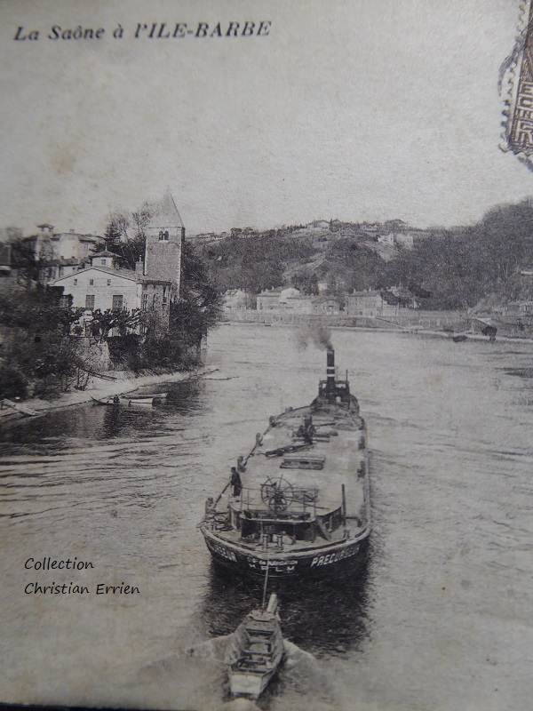 Pour cette fois le bateau a un nom: le PRECURSEUR. C'est une barque du Rhône de la Cie HPLM la carte a été prise à l'Ile Barbe et le timbre nous indique 1931.