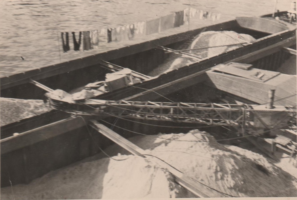Une vieille photo du quai de Javel à Paris, mes parents travaillaient sur le Caucase (barge l'Australien). Une mauvaise manoeuvre du grutier et voilà! Personne en dessous, et mon père a pris son appareil photo.