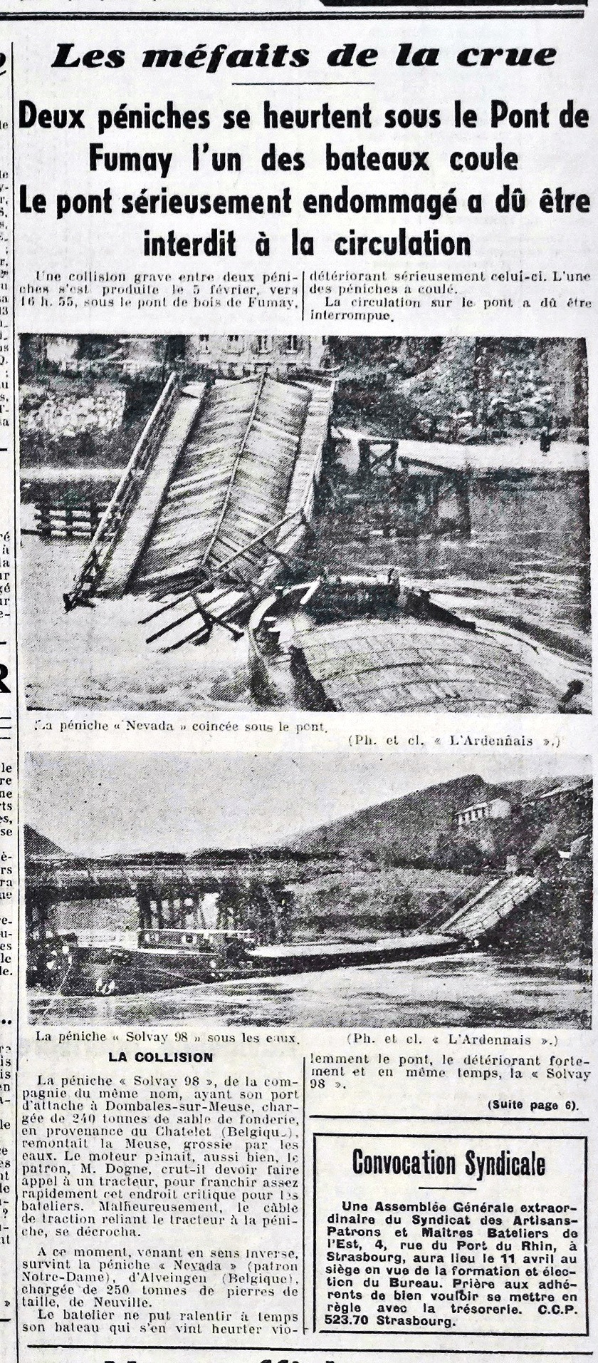 Le 5 février 1955, à 16 h. 45, le bateau automoteur SOLVAY 98, montant, achevait de franchir la passe navigable du pont de Fumay. Pour lutter contre le courant de la Meuse en légère crue, il était aidé par un tracteur de la C.G.T.V.N., son moteur de 30 CV étant trop faible pour le propulser seul.