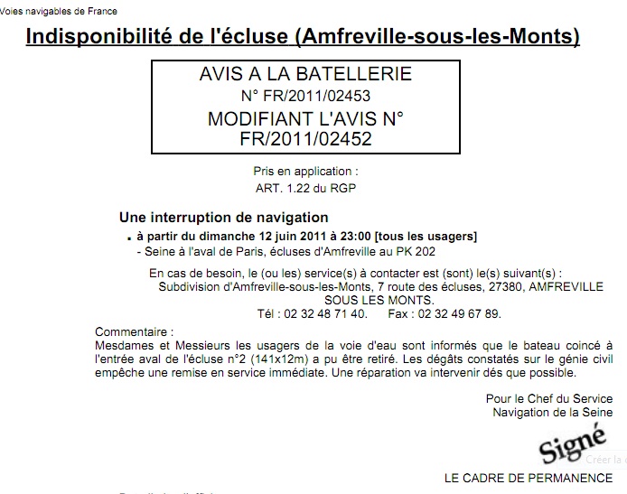 Une interruption de navigation . à partir du dimanche 12 juin 2011 à 15:00 [tous les usagers]