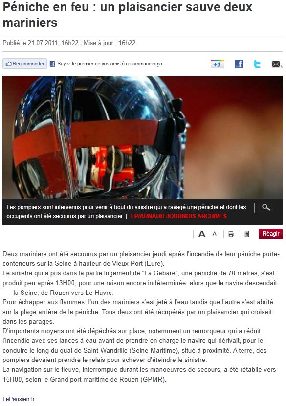 LA GABARE a pris feu durant la descente de Rouen au Havre.