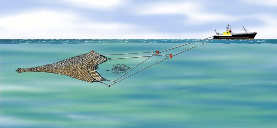 le chalutage pélagique , le chalut se situe entre la surface et le fond, cette technique permet de