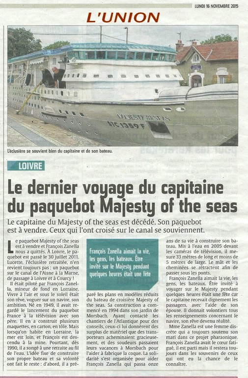 Le Majesty Of The Seas est la célèbre réplique du paquebot de croisière d'une compagnie américaine. Il est à l'échelle 1/8ème et à été construit en Lorraine, en 11 années par M. ZANELLA François, ancien mineur de charbon. Le bateau fait 160m² habitable répartit sur 2 niveaux + 60m² de terrasse.