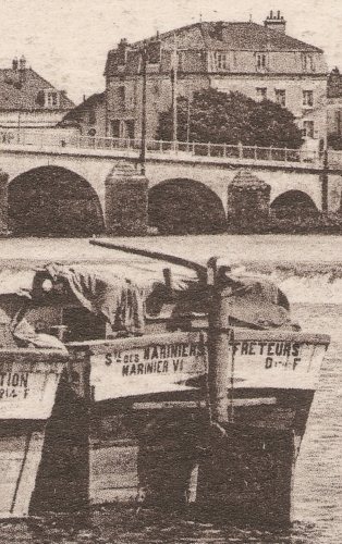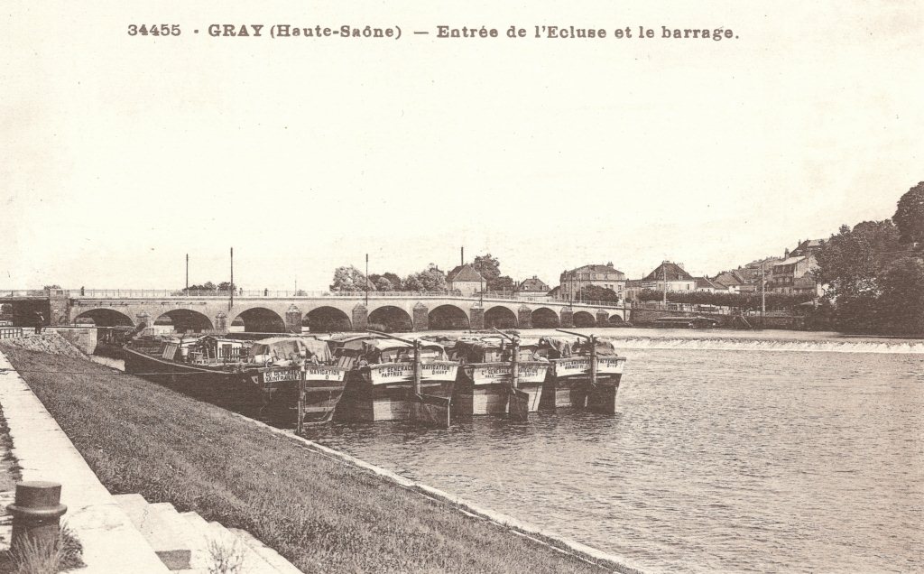 J'aime bien cette CPA de Gray : le remorqueur qui entre dans l'écluse, cheminée baissée, et les quatre flûtes de Bourgogne qui forment certainement son convoi, en attente, et nous montrent leurs devises... avec matricule pour certaines !