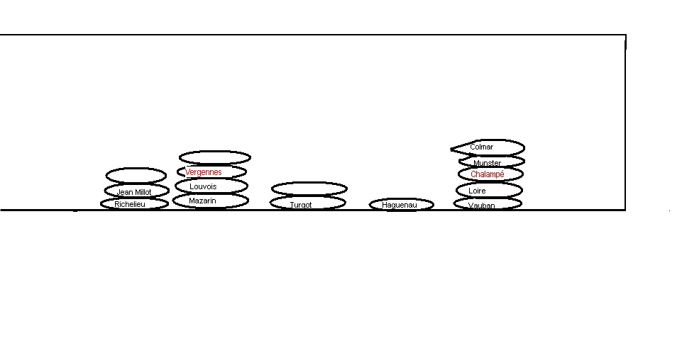 "Buffon", "Chalampé", "Claude Bernard", "Colbert", "Colmar", "Cuvier", "Haguenau", "Jean Millot", "Laplace", "Loire", Louvois", "Mazarin", "Mulhouse", "Munster", "Pasteur", "Richelieu", Seine", "Sully", "Turgot", "Vauban" et "Vergennes".