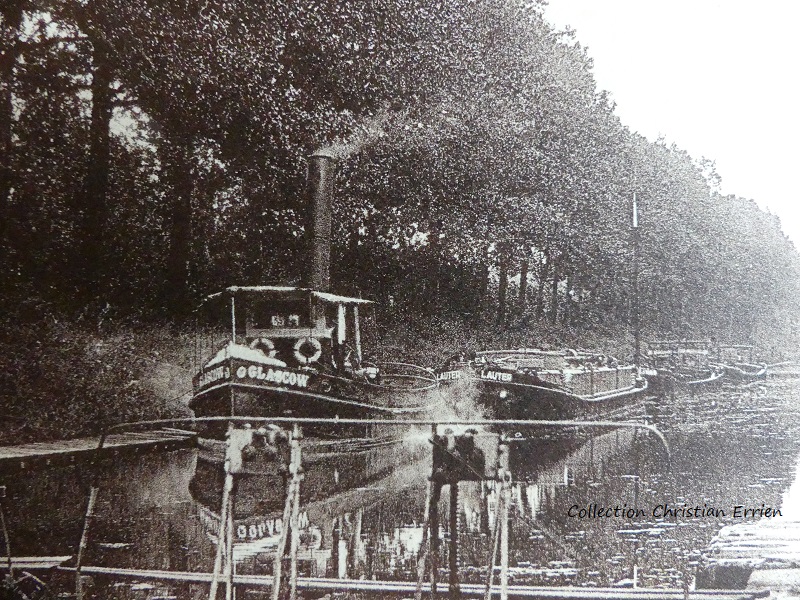 voici le GLASGOW à Lesches sur le canal de Chalifert, il est en amont de l'écluse avec en remorque un chaland pétrolier le LAUTER (extrait d'une carte postale)