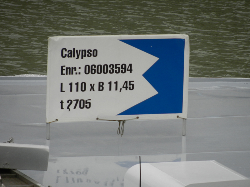 Calypso , 109,98 x 11,45 x 3,23 , 2705 ton , Bouwjaar 2000 , Werf JSC Zaliv Shipyard in Kerch ( Ukraine ) en De Gerlien – Van Tiem in Druten ( Nederland ) , 1800 pk ABC en 571 pk MTU – Veth-Jet boegschrowef , ex Rosarium , eigenaar V. Schneidler in Gernsheim , ENI 06003594.