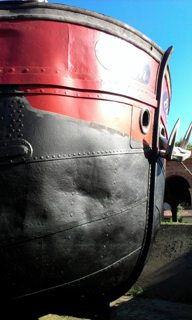 Voilà le nez du bateau, pris cet été en cours de carénage ; il semble qu'il a très peu souffert de l'explosion :