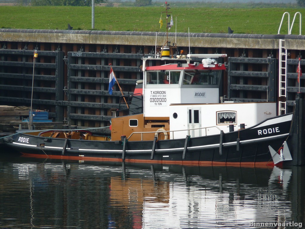 Rodie , 16,96 x 4,47 x 2,24 , 15 ton , Bouwjaar 1948 , Werf De Vliet Den Heeten in Veur ( Nederland ) , 408 pk Cummins , ex Oranje , ex Abeo II , ex 2 x Noordenwind , ex Romatra , ex Heros , ex Rodie , eigenaar Rodie Watertransport BV in Zaandam , ENI 03031300.