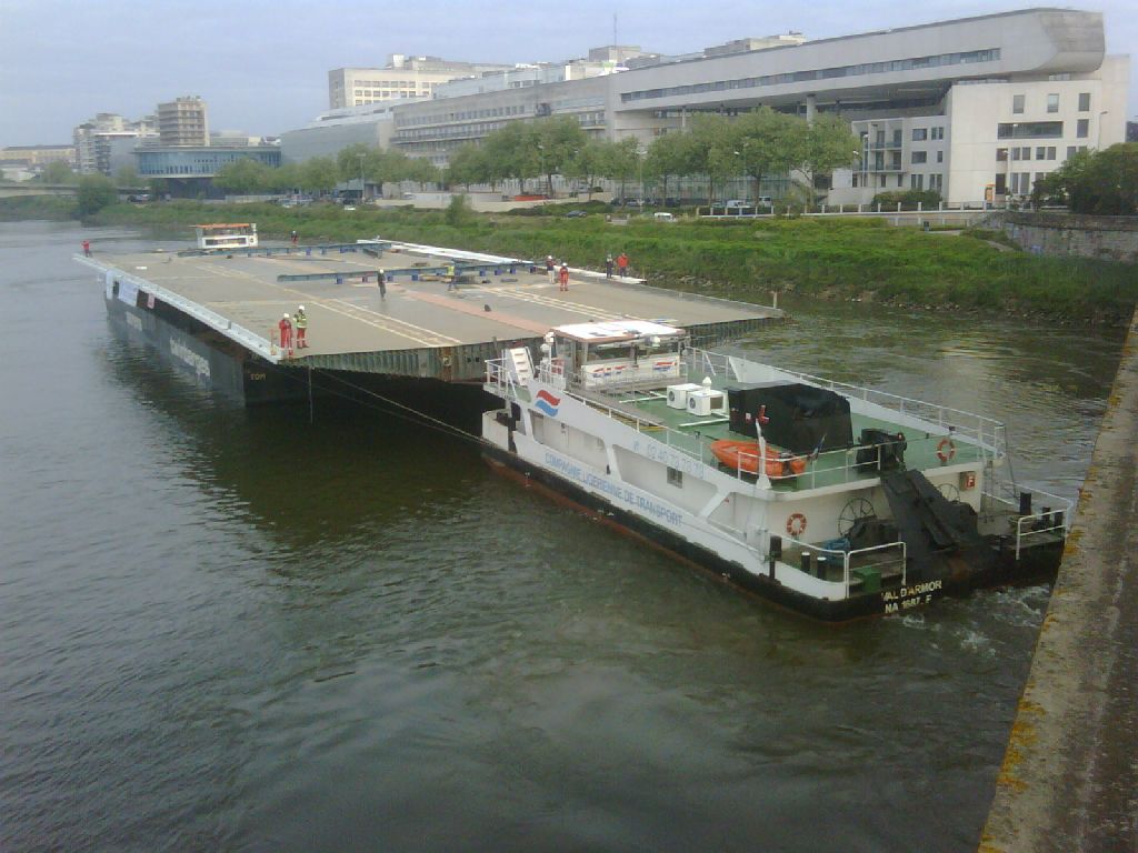 Sur cette photo ,il s'agit d,un convoi spcécial sur la LOIRE qui consiste à acheminer le tablier du nouveau pont ERIC TABARLY sous les pont de NANTES avec deux pousseurs.Le VAL D'AVEL et le VAL D'ARMOR . Le VAL D'ARMOR est parti quelques années sur le RHONE avant de revenir en LOIRE.