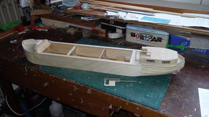 Deux nouvelle photos du model. La mise en place du pavois sur l'arrière , montage du logement , le tout réalises en ctp de 1mm.