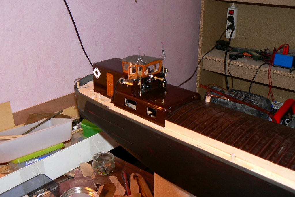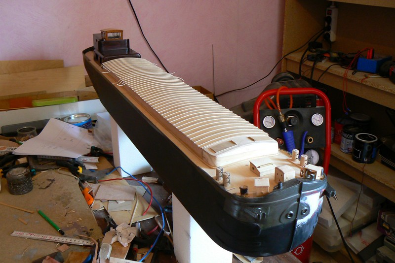 Tout d'abord, une feuille de contreplaqué collée sur deux (ou trois en fonction de la longueur de couverture...) petits tassots façonnées de sorte que les écoutilles aient cette forme arrondies auront été préparées.. et ensuite ???