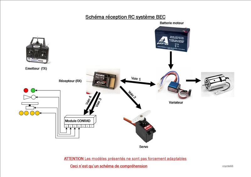 A savoir aussi (j en raconte des choses.....) qu'avec une 4 voies on peu avoir les fonctions de base AV-AR et G-D, mais si on rajoute un module sur le recepteur (qui se connecte sur les voies 3 et 4 à la place des servos) on peu commander 7 fonctions (eclairage, radar, etc etc)