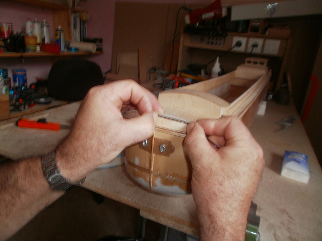 petite astuce pour la fabrication des écoutilles, la fabrication d'un petit chantier qui permet de gardé une forme plus ou moins identiques sur chaque portion, sur ce genre de bateau pas possible de les faire en une pièce a cause de la courbe de la coque, personnellement je les fait par quatre.