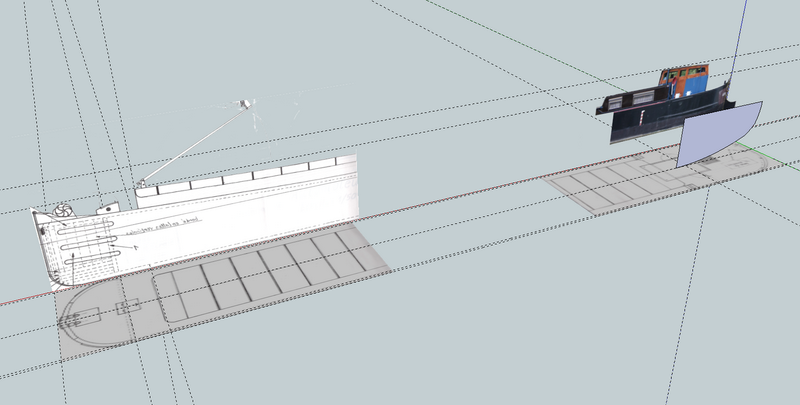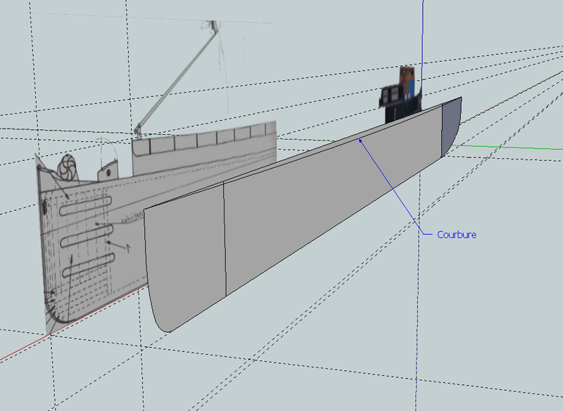 - Photo N°3 : Sur la derniere photo: traçage du rampage, selon les differentes photos de references et avec Sketchup, j ai trouvé (au centre du bateau) 15cm vers le bas par rapport à l'avant et plus 10cm (à l'arriere) par rapport à l'avant.