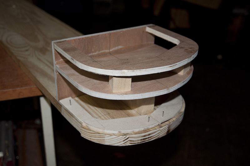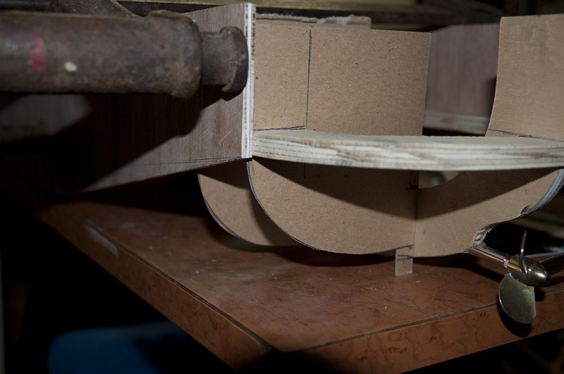 - Photo N°2 : Il me reste juste deux couples, qui en fait seront les extremitées de la cale. Realisés en CTP de 8mm et assemblés en tenons et mortaises.